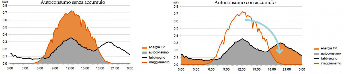 I pannelli fotovoltaici producono molta energia durante le ore centrali della giornata, mentre vi è la necessità di utilizzarla nelle ore serali o mattutine.